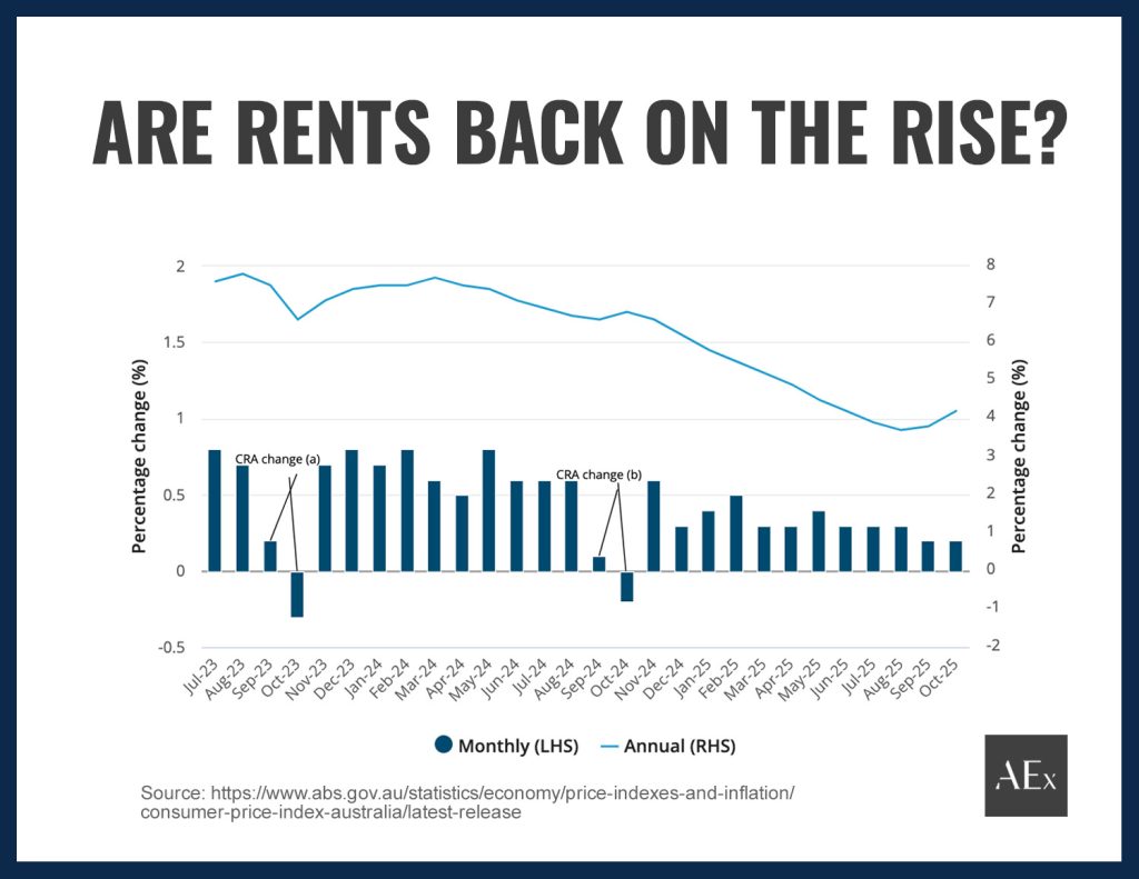 Rents have been a major contributor to living costs, rising 4.2% annually from October 2024 to October 2025, based on the ABS’ latest complete monthly CPI figures.
