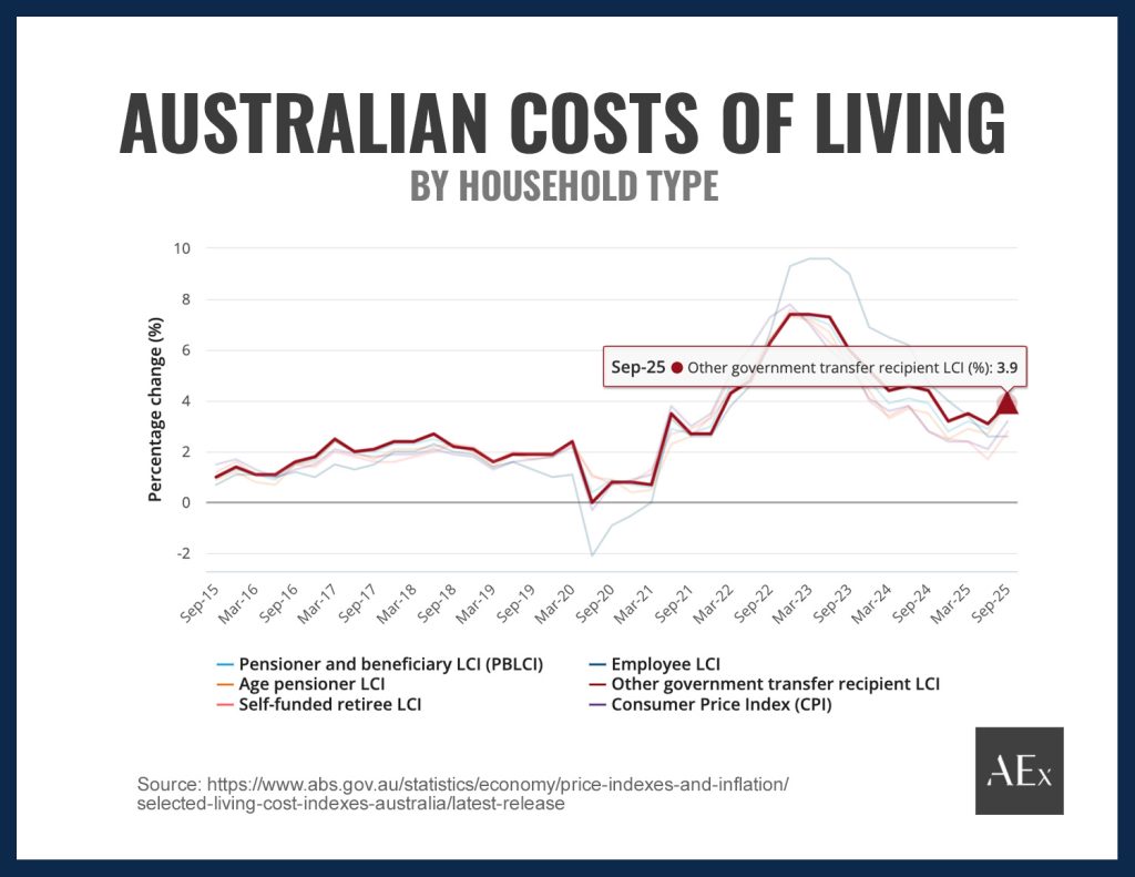 Above: Government payment recipient households saw the largest annual surge in living costs of all household types in the September 2025 quarter – 0.7pp more than CPI.